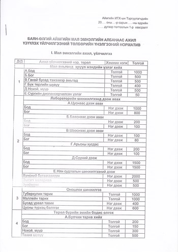 АЙМГИЙН МАЛ ЭМНЭЛГИЙН АЛБАНААС АЖИЛ ҮЗҮҮЛЭХ ҮЙЛЧИЛГЭЭНИЙ ТӨЛБӨРИЙН ҮНЭЛГЭЭНИЙ НОРМАТИВИЙН ТӨСӨЛД ИРГЭДИЙН САНАЛЫГ АВЧ БАЙНА