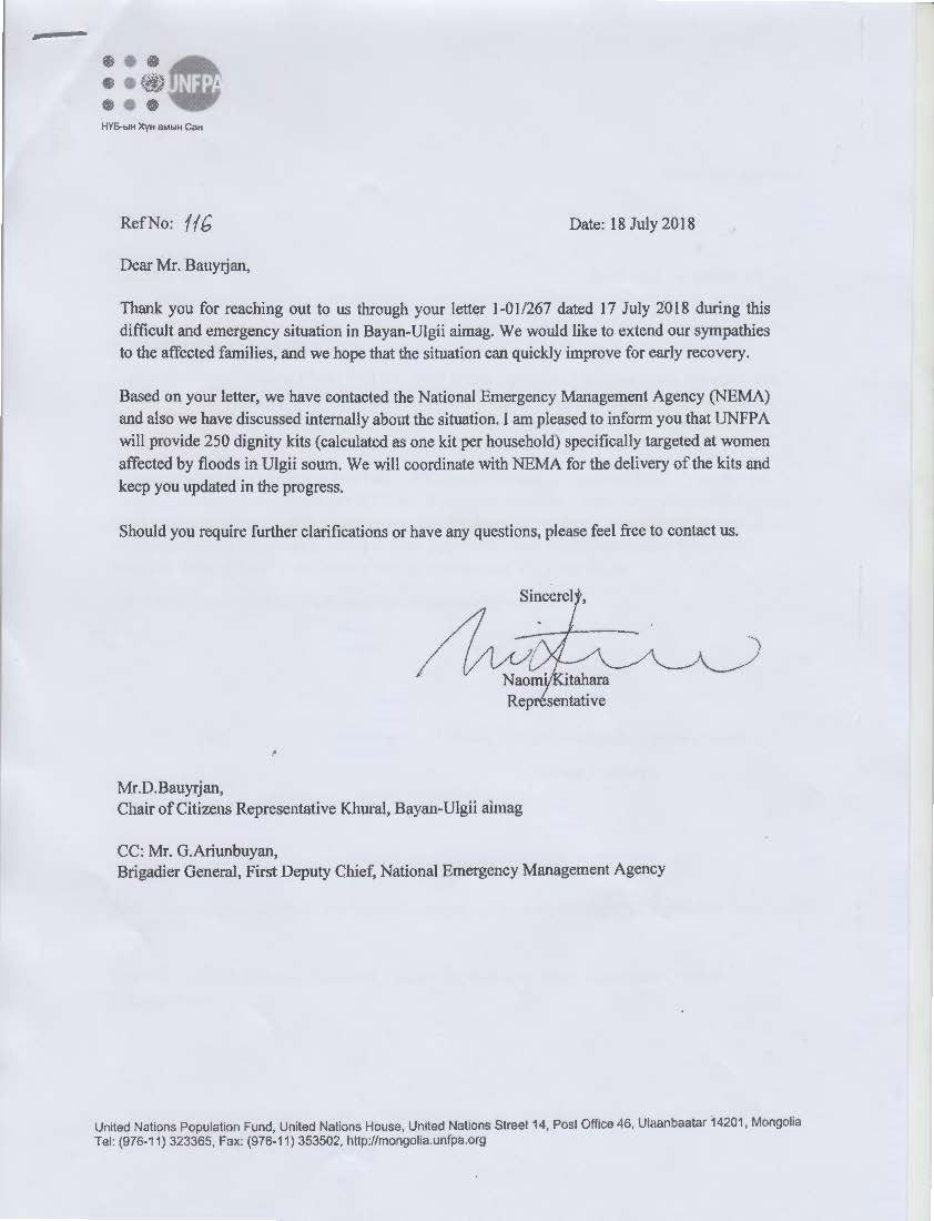 НҮБ-ын Хүн амын сангийн Суурийн төлөөлөгч хатагтай Наоми Китахара гамшигт өртсөн айл өрхүүдэд харамсаж байгаагаа илэрхийлэхийн ялдамд нөхцөл байдал удахгүй сайжирч, хэвийн байдалдаа хурдан орно гэдэгт итгэлтэй байгаагаа илэрхийлж, аймгийн ИТХ-ын даргын илгээсэн албан бичгийг үндэслэн НҮБ-ын Хүн амын сангийн зүгээс эмэгтэйчүүдийн ариун цэвэр эрүүл ахуйн багцыг гамшигт өртсөн 250 өрхийн тус бүр 1 эмэгтэйд өгөхөөр шийдвэрлэсэн байна. Багцуудыг хүргүүлэх ажлыг ОБЕГ-тай хамтран зохион байгуулахаар болсон байна.