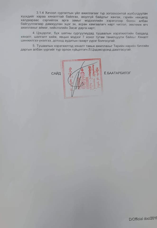 БСШУС-ын сайдын Ерөнхий боловсролын сургууль, МСҮТөв Их дээд сургуулийн үйл ажиллагааг 3-р сарын 02-ний өдөр хүртэл зогсоох, мөн урьдчилан сэргийлэх арга хэмжээ авч ажиллахыг үүрэг болгосон 2020.01.27 А/43 тоот тушаал гарсан байна.