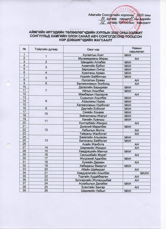 Баян-Өлгий аймгийн Сонгуулийн хорооноос аймаг, нийслэл, сум, дүүргийн иргэдийн Төлөөлөгчдийн Хурлын 2020 оны ээлжит сонгуульд сонгогчдын хамгийн олон санал авсан 39 нэр дэвшигчдийг Баян-Өлгий аймгийн иргэдийн Төлөөлөгчдийн Хурлын Төлөөлөгчөөр сонгогдсонд тооцох тухай тогтоолыг аймгийн Сонгуулийн хорооны дарга А.Серикболат, нарийн бичгийн дарга Х.Бахыт болон сонгуулийн хорооны гишүүд 2020 оны 10 дугаар сарын 20-ны өдөр аймгийн иргэдийн Төлөөлөгчдийн Хурлын дарга Д.Бауыржанд өргөн барьлаа.