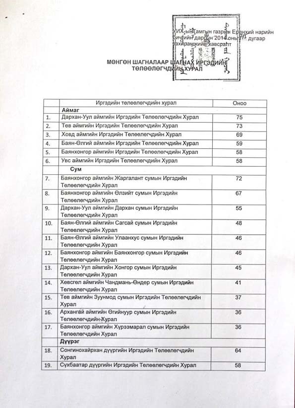 Мөн 330 сумуудаас Баян-Өлгий аймгийн Сагсай, Улаанхус сумууд 4-5 байрт шалгарч тус бүр мөнгөн шагналаар шагнуулахаар болсон байна.