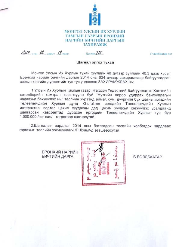Улсын Их Хурал, Швейцарийн хөгжлийн агентлаг, НҮБ-ын Хөгжлийн хөтөлбөрийн хамтран хэрэгжүүлж буй “Нутгийн өөрөө удирдах байгууллагын чадавхыг бэхжүүлэх нь” (MON-13/101) төслийн хүрээнд Иргэдийн Төлөөлөгчдийн Хурлуудын нэгдсэн, портал цахим хуудас Khural.mn-ийг 2013-2014 онд бүтээсэн билээ. Бүх шатны аймаг, сум, дүүргийн ИТХ-ын дэд цахим хуудсыг хөгжүүлэх, тэдгээрийн мэдээ мэдээллийн чанар, стандартыг сайжруулах ИТХ-ын санал санаачилгыг дэмжих зорилгоор 2014 оны 11-р сарын 13-наас 12-р сарын 15-ныг хүртэлх хугацаанд “Khural.mn Иргэдийн Төлөөлөгчдийн Хурлын интерактив, портал цахим хуудасны дэд цахим хуудсыг хөгжүүлэх уралдаан”-д нийт 21 аймгаас Баян-Өлгий аймаг дөрөвдүгээр байранд шалгарсан байна.