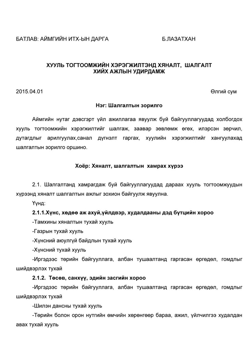 2015 оны 04 дүгээр сарын 01-ний өдөр Баян-Өлгий аймгийн ИТХ-ын дэргэдэх хороодын хурал болов. Уг хуралдаанаар хууль тогтоомжийн хэрэгжилтийг хангуулах, хариуцлагыг сайжруулах зорилгоор аймгийн ИТХ-ын Тэргүүлэгчдээс удирдамжаар хийх хяналт, шалгалтын талаар чиглэл өгөв