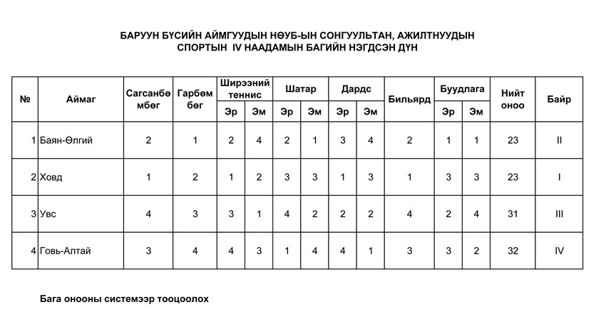 дүнгээр Ховд аймгийн баг тамирчид шилжин явах цомын эзнээр тодорлоо. Мөн