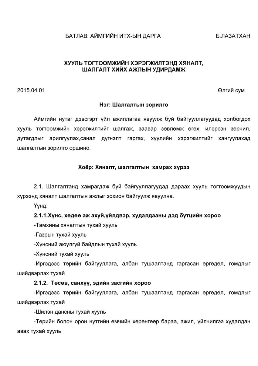 хангуулах зорилгоор Баян-Өлгий аймгийн ИТХ-аас удирдамж баталсан юм. Хяналт шалгалт хийх ажлын хэсгийн бүрэлдэхүүнд аймгийн ИТХ-ын 5 хороодын дарга, гишүүд, холбогдох мэргэжлийн байгууллагуудын төлөөллийг оролцуулсан болно.
