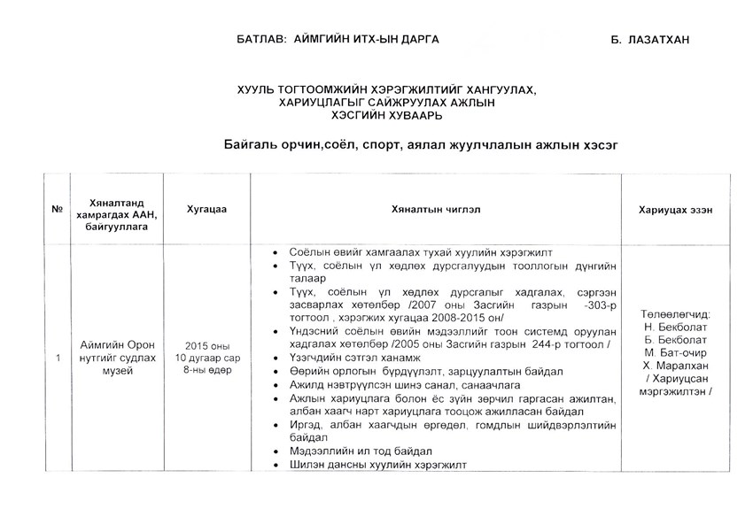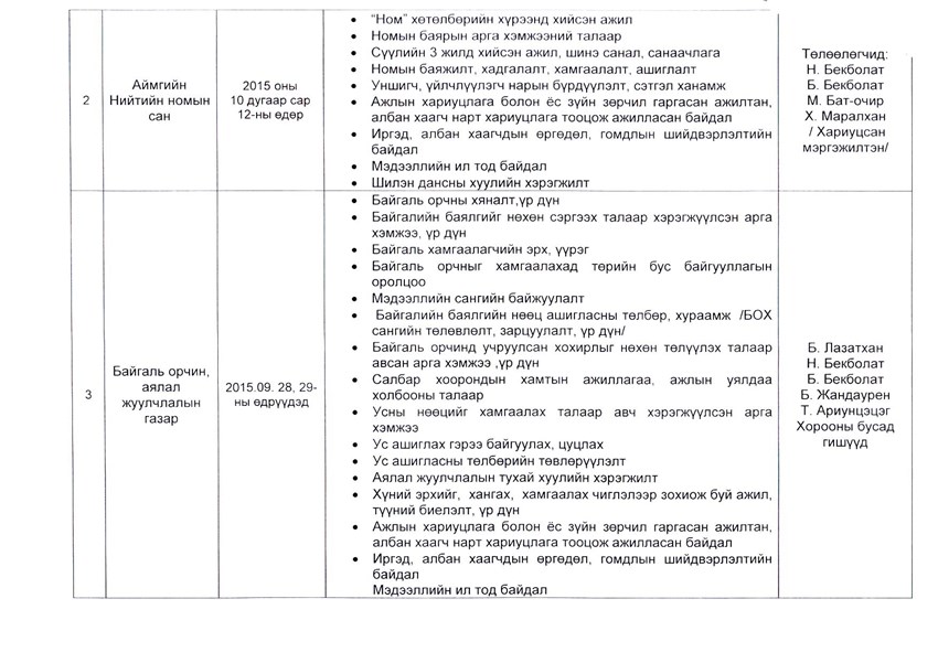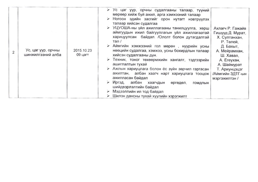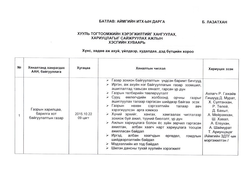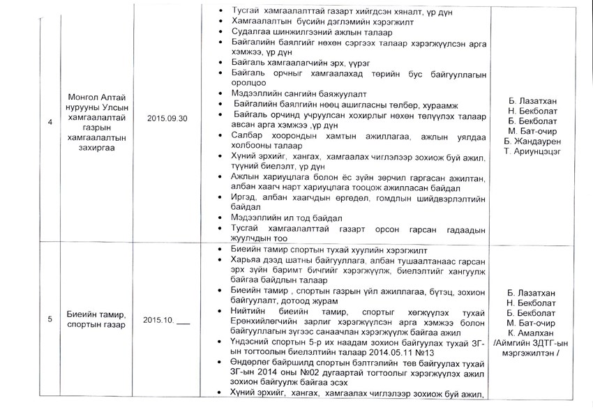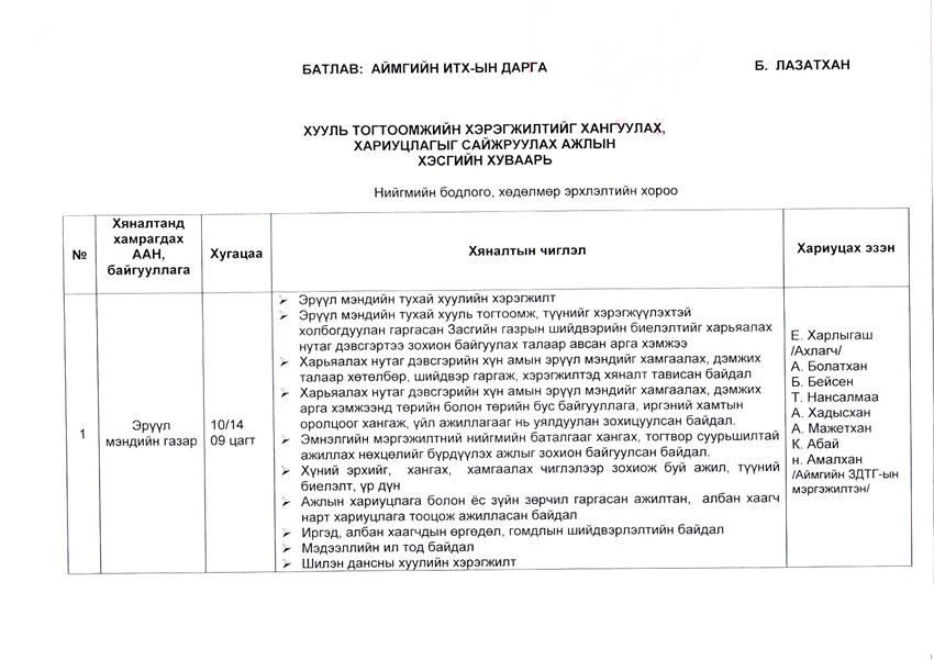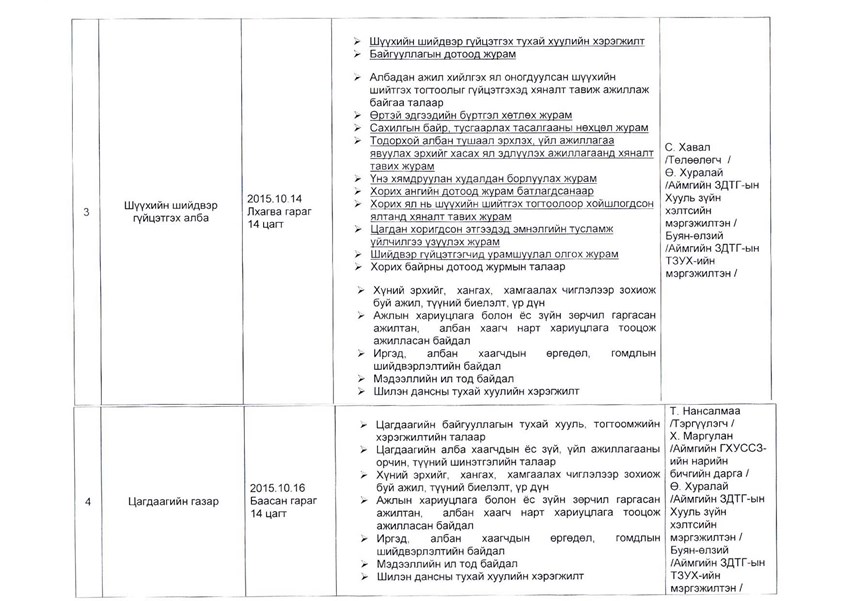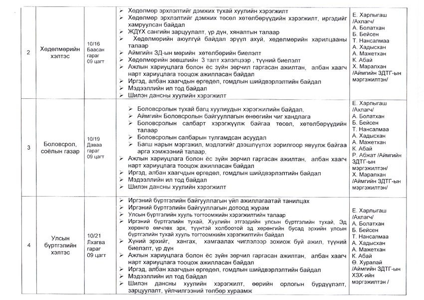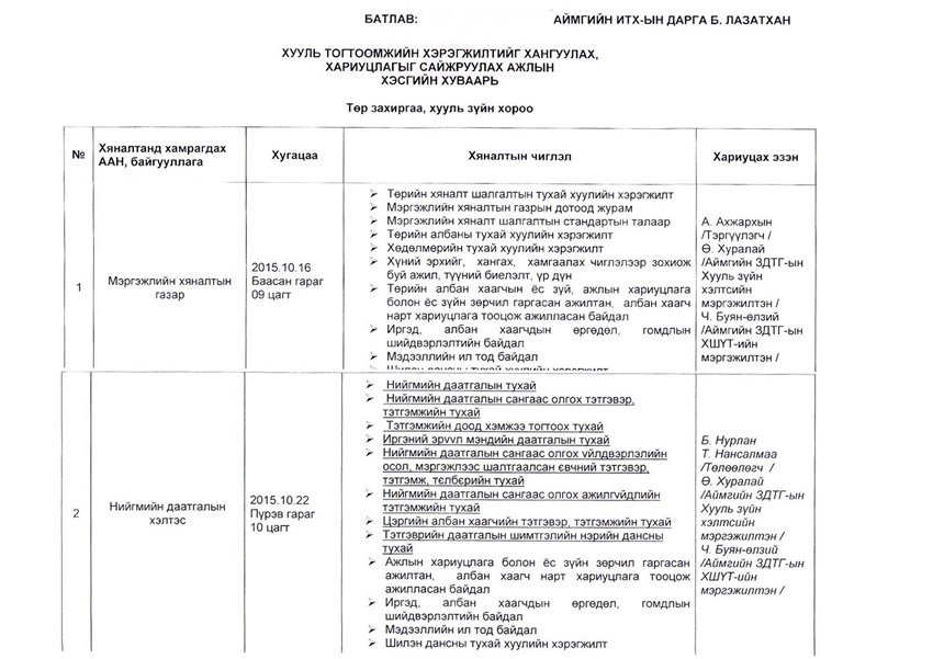 Аймгийн ИТХ-аас байгуулсан ажлын хэсгүүд өнөөдрөөс эхлэн удирдамж болон төлөвлөгөөний дагуу Эрүүл мэндийн газар, Шүүхийн шийдвэр биелүүлэх алба, Цагдаагийн газар, Хөдөлмөрийн хэлтэс, Улсын бүртгэлийн хэлтэс, Нийгмийн даатгалын хэлтэс, Боловсрол, соёлын газрын үйл ажиллагаатай танилцаж, хууль тогтоомжийн хэрэгжилтийг хангуулах ажлыг эхлүүлээд байна.