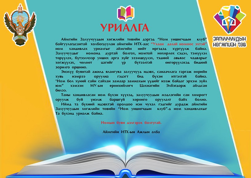 Аймгийн Залуучуудын хөгжлийн төвийн дэргэд “Ном уншигчдын клуб” байгуулагдсантай холбогдуулан аймгийн ИТХ-аас “Ухаан далай номоос эхтэй” ном хандивлах уриалгыг аймгийн нийт иргэдэд хүргүүлж байна.