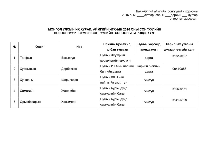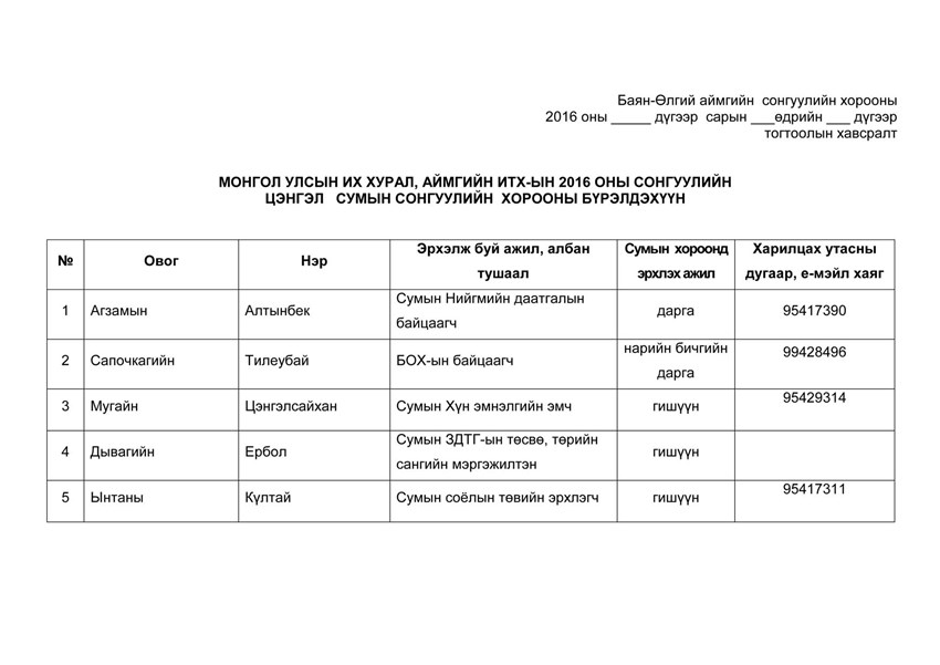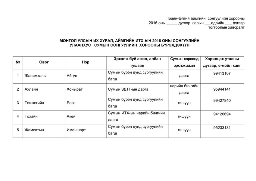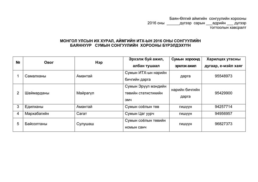 Нарийн бичгийн дарга: Д.Аманбек - Аймгийн Бүртгэл, статистиктийн газрын Улсын бүртгэлийн хэлтсийн ахлах бүртгэгч