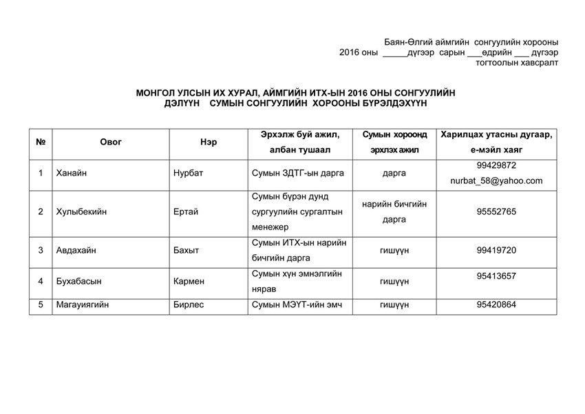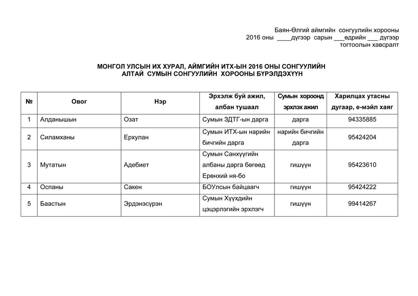 Баян-Өлгий аймгийн сонгуулийн хороо Сонгуулийн Ерөнхий хорооны 2016 оны 04 дүгээр сарын 18-ны өдрийн 21 дүгээр тогтоолоор дараах бүрэлдэхүүнтэйгээр байгуулагдсан юм. Үүнд: