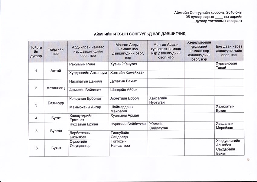 МАХН-аас нэр дэвшигч хоёр хүний материал дутуу ирүүлсэн тул хасав. Бие даан нэрээ дэвшүүлэгч нэг хүний материал нь зөрчилтэй материал байгаа тул шалгагдаж байна.