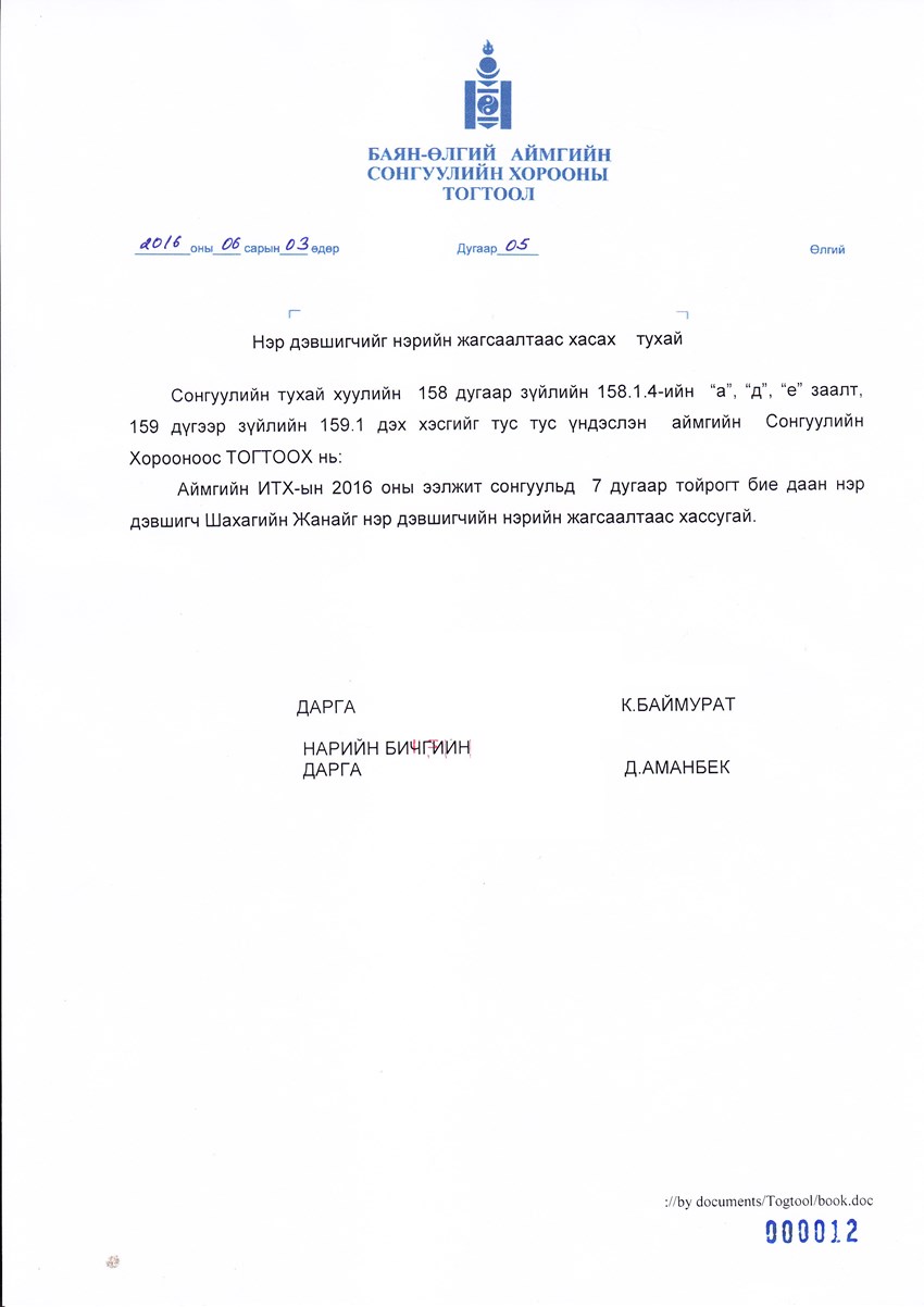 Аймгийн Сонгуулийн хорооны 2016 оны 06 дугаар сарын 03-ны өдрийн хуралдаанаар аймгийн ИТХ-ын 2016 оны ээлжит сонгуульд 7 дугаар тойрогт бие даан нэр дэвшигч Шахагийн Жанайг нэр дэвшигчийн нэрийн жагсаалтаас хасав.