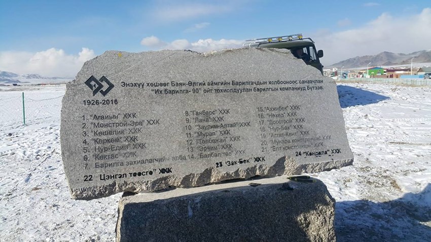 Бүтээн байгуулалтын хөгжил цэцэглэлтэд гар бие оролцон зүтгэж байгаа "Агаиын" ХХК, "Монстрой-Эра" ХХК, "Көшелик" ХХК, "Көркем" ХХК, "Нур-Едик" ХХК, "Көктас" ХХК, Барилга захиалагчийн алба, "Ганбарс" ХХК, "Лана" ХХК, "Заулим-Алтай" ХХК, "Мурап" ХХК, "Толбожай" ХХК, "Эрчим" ХХК, "Балбал тас" ХХК, "Ахжибек" ХХК, "Нөхөд" ХХК, "Досстрой" ХХК, "Нур-Бах" ХХК, "Асгат-Кент" ХХК, "Мунара констракшн" ХХК, "Ёлт констракшн" ХХК, "Цэнгэл тоосго" ХХК, "Зак-Бек" ХХК, "Кендала" ХХК-ууд хамтран аймгийн төвд "Их барилга-90" дурсгалын хөшөөг босголоо.