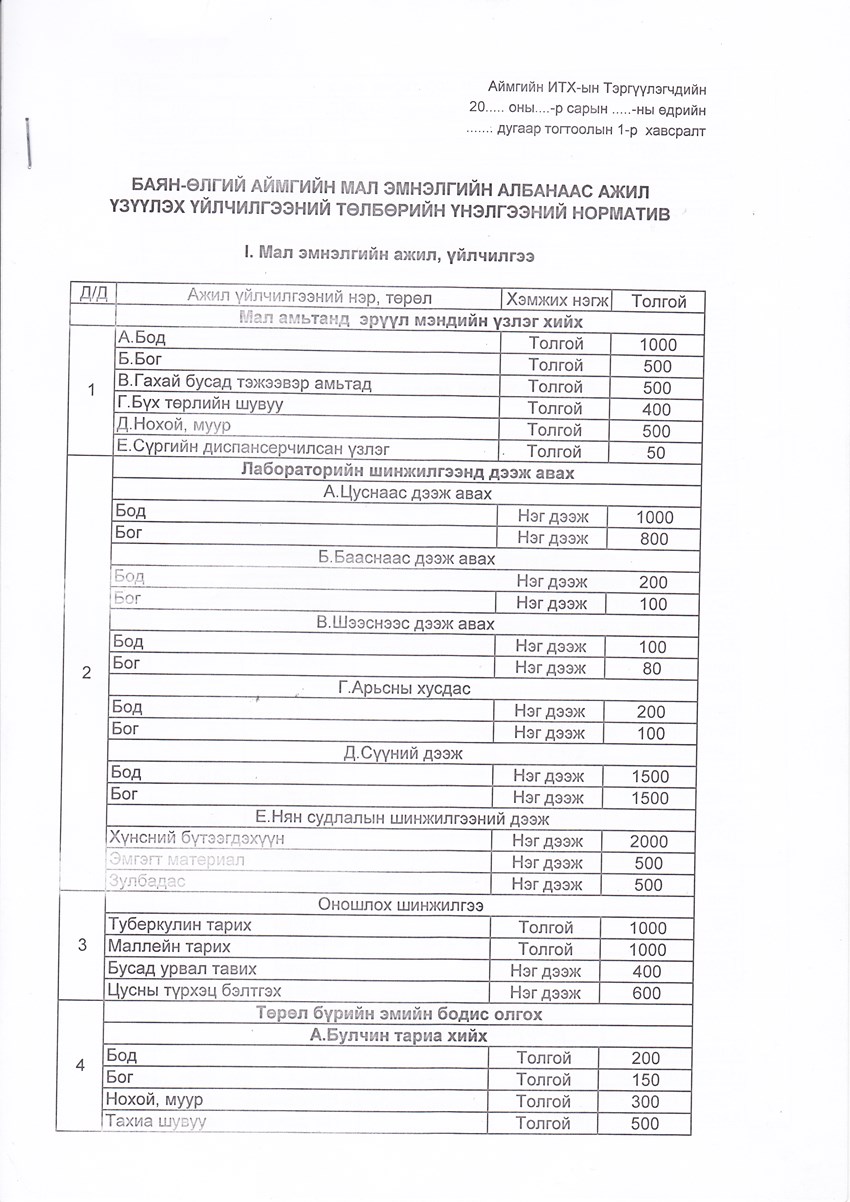 АЙМГИЙН МАЛ ЭМНЭЛГИЙН АЛБАНААС АЖИЛ ҮЗҮҮЛЭХ ҮЙЛЧИЛГЭЭНИЙ ТӨЛБӨРИЙН ҮНЭЛГЭЭНИЙ НОРМАТИВИЙН ТӨСӨЛД ИРГЭДИЙН САНАЛЫГ АВЧ БАЙНА